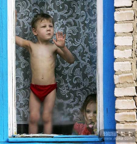 2006年3月30日,在切尔诺贝利核电站30公里隔离区内,6岁的小女孩玛丽亚从家中朝窗外挥手。玛丽亚是生活在30公里隔离区内的唯一一名儿童。