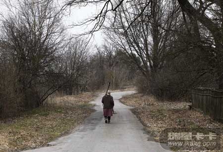2011年4月4日,78岁的乌克兰老人加娜走在切尔诺贝利核电站30公里隔离区以内的村中小路上。乌克兰政府规定离核电站30公里以内的地区为“禁入区”,不准人居住,但一些老人想在故土安度晚年,便偷偷返回居住地。他们在“禁入区”内种菜、捕鱼和饲养家畜,但产品只能供自己食用。