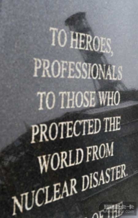 2011年2月24日,在切尔诺贝利核电站外拍摄的倒映着核电站建筑的纪念碑。