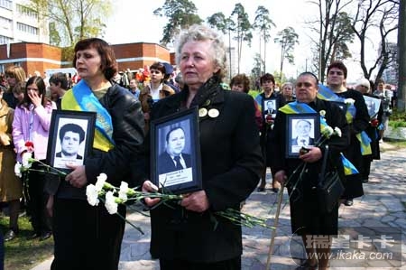 2006年4月26日,在乌克兰首都基辅的切尔诺贝利死难者纪念碑前,核事故死难者的家属手捧亲人遗像参加祭奠活动。