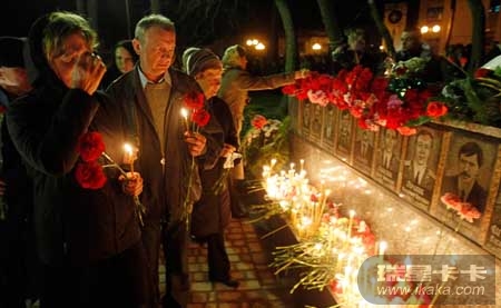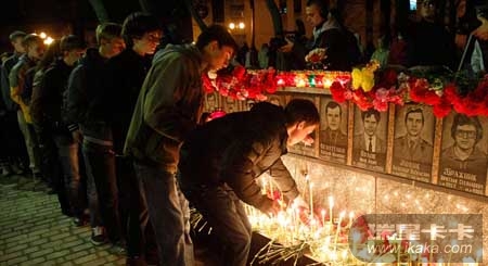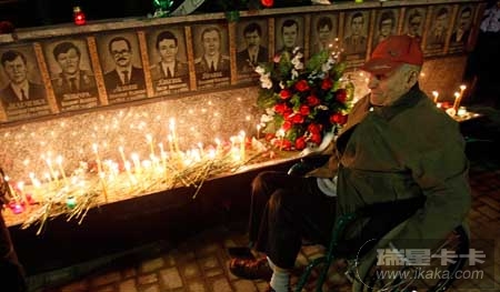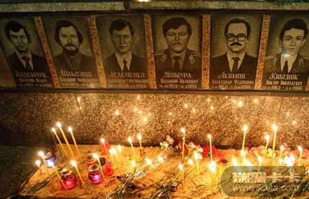 2011年4月26日,乌克兰切尔诺贝利核电站附近的小城斯拉夫蒂奇,人们点燃蜡烛纪念在切尔诺贝利核事故中英勇献身的消防员。今年的4月26日是切尔诺贝利核事故25周年的纪念日。1986年4月26日当地时间1时24分,前苏联乌克兰共和国切尔诺贝利核电站发生严重泄漏及爆炸事故,这是人类和平利用核能以来最严重的灾难之一。
