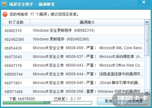 请楼主提供您的 系统版本号(包括SP版本),瑞星安全助手版本号,这17个漏洞补丁编号,查看控制面板/添加删除程序中是否已安装这些补丁,手动下载补丁安装提示什么?系统的自动更新是否会提示有这些漏洞?