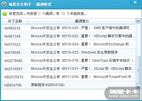 做完系统,安装卡卡后提示打补丁,但为什么有17个漏洞补丁总是打不完啊?每次开机都提示,我按了修复后,再转为后台修复,也没看到它成没成功,但下次开机时又提示。