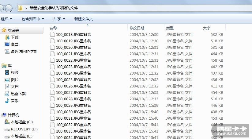 装了卡卡,电脑桌面就多了个文件夹“瑞星安全助手认为可疑的文件”,点击进去就是上面截图这样,里面都些照片,不过照片文件名JPG后面自己给加上了重命名。