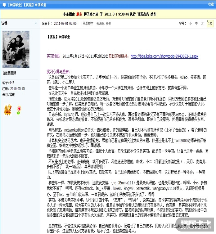 3、实习生在实习期间的发回帖要求:在卡卡论坛求助区(不含企业级安全产品区)、技术区、瑞星知道及指定外部合作论坛发回帖,整学期的有效帖量不少于400,发帖质量通过审核;