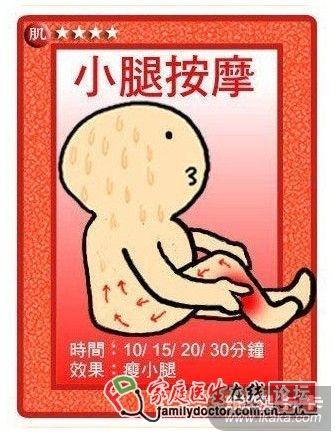 小腿xxx也是小S每日的必修课,因为要避免小腿腹发展成为肌肉,所以xxx的时候要很用力,不是那种舒服的xxx,是要按到会痛会酸的那种,针对腿腹部分用力的压捏xxx,让肌肉变软,然后由脚踝往上经过小腿腹到膝盖,由下往上xxx,xxx的时候小腿尽量放松,大概如上图的坐姿,膝盖曲起,让小腿腹自然下垂,再按上面方法xxx。