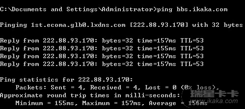 Ping bbs.ikaka.com的运行结果(开始—运行—输入cmd回车,输入Ping bbs.ikaka.com回车,运行完毕后截图保存)