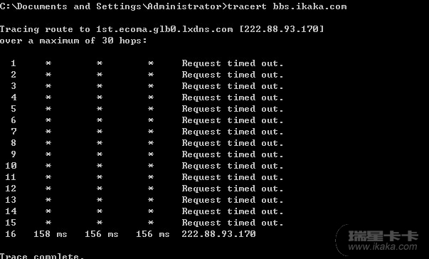 tracert bbs.ikaka.com的运行结果(开始—运行—输入cmd回车,输入tracert bbs.ikaka.com回车,运行完毕后截图保存)