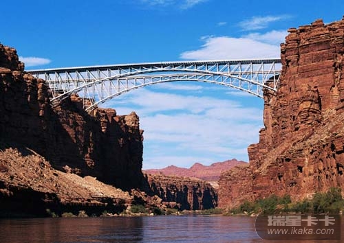 7. 美国亚利桑那州格兰峡谷国家公园内的那瓦约桥是一座三角拱腹的拱桥,全长142米,横跨格兰峡谷和科罗拉多河之上。老那瓦约桥已经无法满足目前的交通需求,因此人们又建造了一座和它一模一样的姊妹桥。该桥于1995年投入使用,老桥现在则只供步行者通行。
