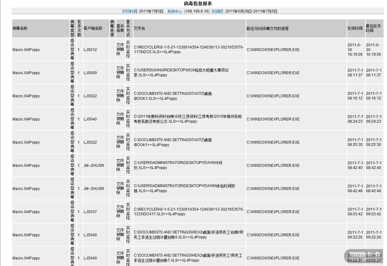 1、发现这个病毒的计算机使用人员 在打开一个EXCEL文件时,提示有宏病毒,瑞星杀毒软件自行删除病毒,可当打开这个文件时,文件中的数据很多看不见(原来的表格是有数据),或者成空白。