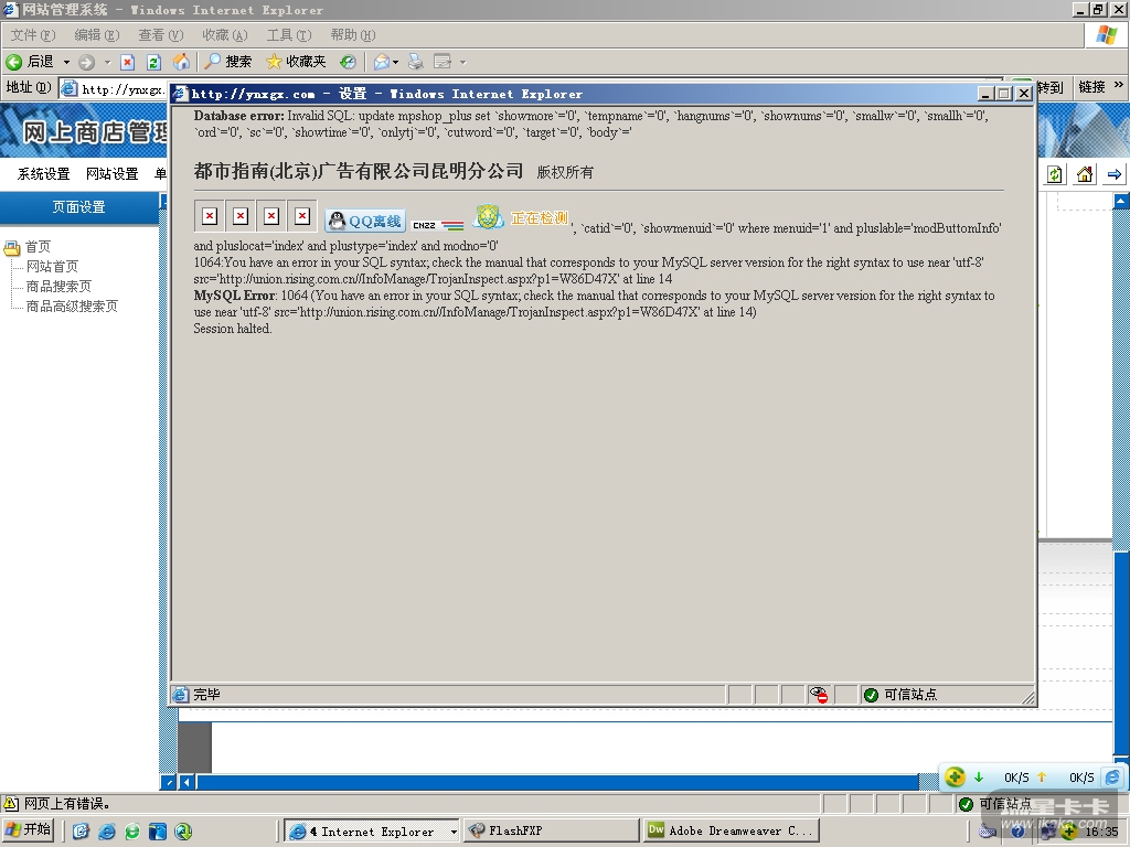 MySQL Error: 1064 (You have an error in your SQL syntax; check the manual that corresponds to your MySQL server version for the right syntax to use near 'utf-8' src='http://union.rising.com.cn//InfoManage/TrojanInspect.aspx?p1=W86D47X' at line 14)
