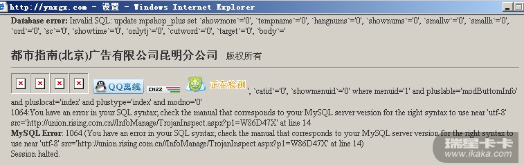 MySQL Error: 1064 (You have an error in your SQL syntax; check the manual that corresponds to your MySQL server version for the right syntax to use near 'utf-8' src='http://union.rising.com.cn//InfoManage/TrojanInspect.aspx?p1=W86D47X' at line 1)