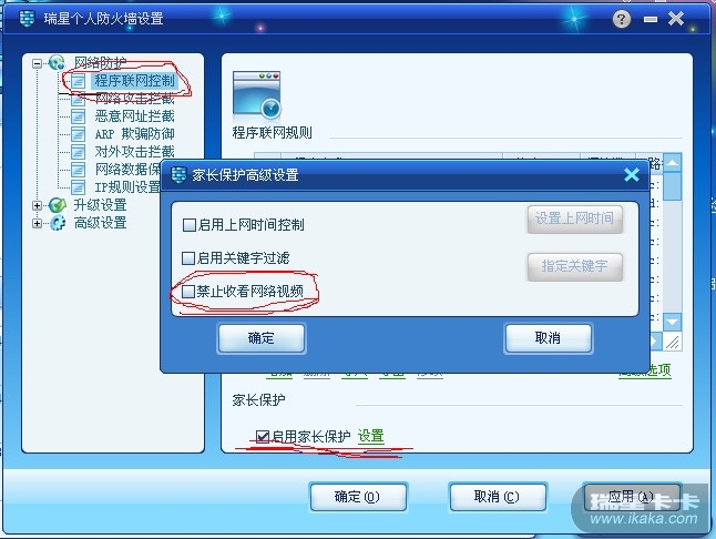 网络防护--》联网程序控制中启用了“家长保护”功能,其中的“禁止收看网络视频”会阻值网络视频。