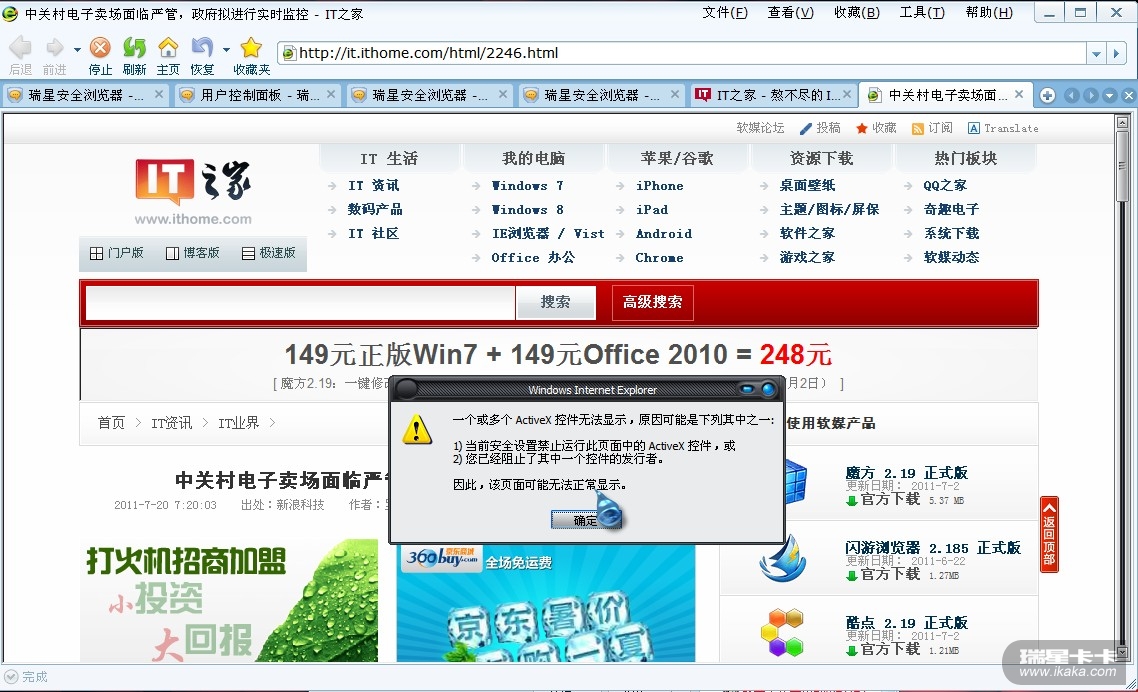 http://www.ithome.com/上浏览新闻链接会“随机”出现ActiveX控件报错,我开始认为是某些特定连接出现问题,但是后来发现你连续打开新闻链接时,就会“随机”出现控件报错的问题。