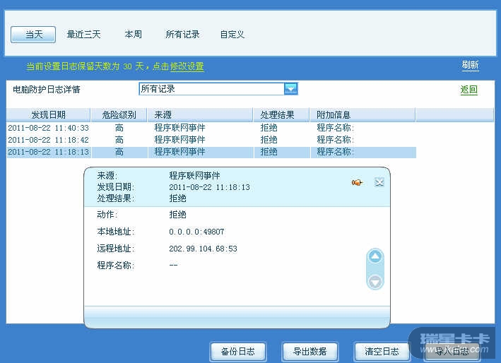 请您提供瑞星防火墙版本及瑞星日志。