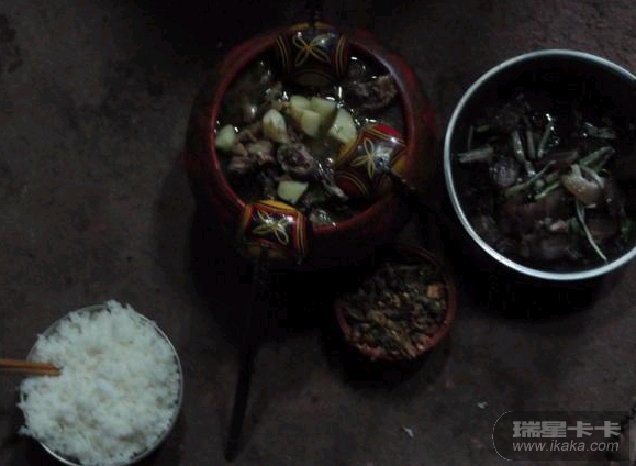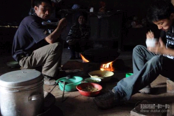 我们的晚饭很简单,就是荞馍馍和水煮的生菜。这两样东西加上被当地人称之为“洋芋”的土豆是彝族山民日常饮食的主食,我很吃惊,这些食物索然无味。罗老师的太太在篝火上的一口大铁锅上辛勤地做着吃的东西,她没有加油、盐或其它调味品。罗太太做完菜,将它盛入朔料盆内,我们围着盆坐。根据彝族习俗,客人和主人围城一圈,其它家人围成另外一圈。以示礼貌。当我咬第二口荞馍馍的时候,我想到了爸爸的朋友们在上海一家高级的美国品牌酒店内请我们吃的高级自助餐。想到未来整整一个星期我们将要吃的东西,我开始有点忐忑不安。