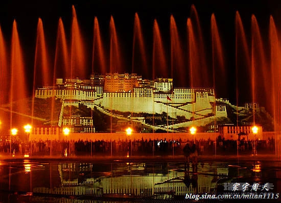 宽阔的布宫广场之上随风起舞的喷泉水帘