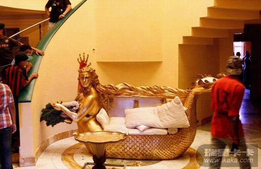 8月26日,拍摄于卡扎菲女儿阿伊莎住宅内的镀金沙发,沙发一头是阿伊莎的头像,造型就像一条美人鱼。阿伊莎的头像还出现在很多其它房间内。