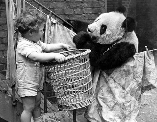 1938年,五头大熊猫从中国非法走私到了英国,其中四头被伦敦动物园购买。图片中是当时给大熊猫拍照的摄影师Bert Hardy的儿子被大熊猫拍照的场景。