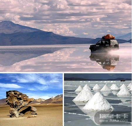 乌尤尼盐沼 阿尔蒂普拉诺(或称“高平原”)是玻利维亚安第斯山区的一个大高原,海拔在3000米以上。在高原南端有一些冰融化时留下的盐湖,而在1万年前最后一次冰期未,湖水已逐渐流失。最大并且令人印象最深的湖泊是乌尤尼盐沼,每年冬季,它被雨水注满,形成一个浅湖;而每年夏季,湖水则干涸,留下一层以盐为主的矿物硬壳,中部达6米厚。人们可以驾车驶越湖面。湖面像镜子一样闪闪发光,尤其是在雨后