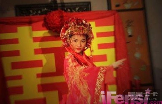《仙剑奇侠传》里的刘亦菲扮演赵灵儿——一个有着蛇妖血统的苗族少女, 所以她的新娘装头饰有异于汉族传统的新娘头冠。