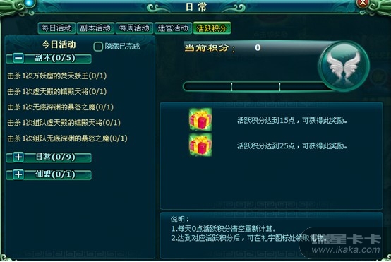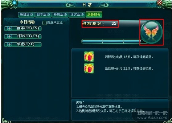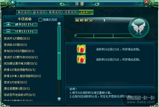 今日活动内容会随着玩家等级的提升而慢慢增多,此时玩家所能获得的总积分也会随着增多。当玩家达到一定的积分后,右边翅膀图标也会随着改变,更加多姿多彩。更高的积分还能获得更高级的积分礼包奖励哦。1.