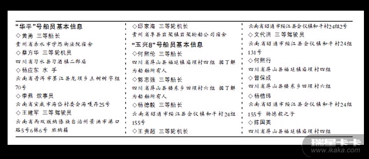 另据泰国媒体报道,泰国军方10月5日接到qiang走私入境线索,在当地时间下午1点半左右发现“华平号”和“玉兴8号”,并与船上5名武装人员交火,其中一人被击毙,其余逃离,被击毙武装分子不是中国籍。几天后,泰国警方相继从湄公河捞起了11具中国船员尸体,初步判断,船只应该是被毒贩劫持,杀害船员也是劫匪所为。