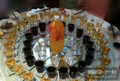 第一圈是啤酒,第二圈是红酒,第三圈是白酒。每个杯子下面有张扑克,但是每一圈里面只有一张王牌。新郎找10个人闯关,新娘的10个朋友守关。冲关者在每一圈里面抽牌,直到抽到王就不喝,剩下的全部是守关者喝,每一圈以此类推。