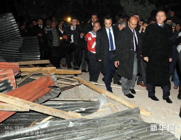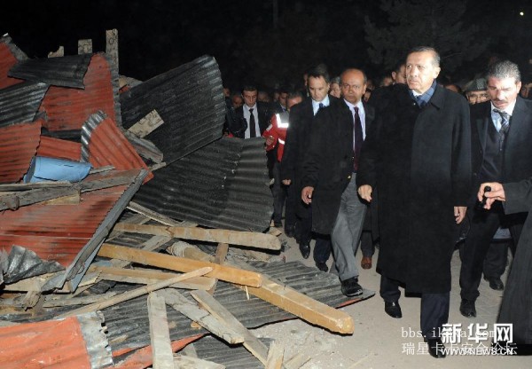 土耳其总理埃尔多安视察地震灾区 10月23日,在土耳其东部凡省,土耳其总理埃尔多安(右二)抵达地震灾区现场视察。