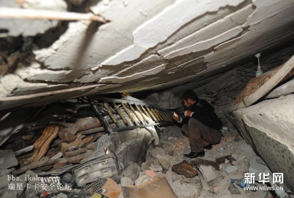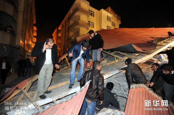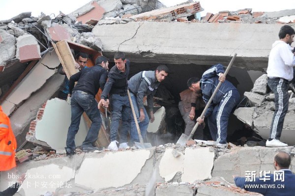 10月23日,在土耳其东部凡省,两名男子尝试从废墟中寻找物品.据土耳其道安通讯社23日报道,到目前为止,土耳其东部凡省地震已造成85人死亡、500多人受伤.土耳其伊斯坦布尔地震研究中心已将凡省当天发生的地震级别由先前公布的里氏6.6级上调为里氏7.2级,并估计此次地震可能造成数百人死亡.