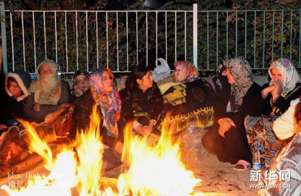 10月23日,在土耳其东部凡省地震灾区,当地居民坐在火堆旁取暖.