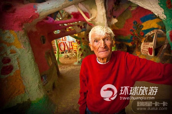 莱昂纳多-奈特在美国加利福尼亚的沙漠中已经住了26年了,一辆经过改装的废旧消防车就是他的家。消防车被取名为“救世主卡车”,上面写着一些圣经中的诗句。但是真正吸引人们眼球的不是卡车而是他家的“后院”,奈特用了成千上万升的泥土和颜料把他家周围的山坡涂了个遍,山上可见到“上帝即爱”的字眼。