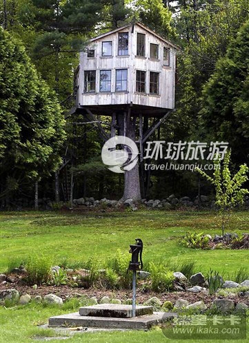 怀旧之情促使美国出版商彼特-刘易斯在其后院建造了一座树屋。这座两层的房子建在一棵已有200年历史的树上,距离地面6.4米高,重达3吨,可通过吊桥和旋转楼梯上下。