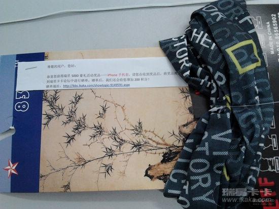 来自广东佛山市顺德区,我一直都是用瑞星的杀毒软件、防火墙,前几天抽到了4000多积分,用2000积分换了户外魔术头巾,过了几天就收到了,速度是蛮快的。不过工作人员把奖品名称打成:iphone手机壳,哈哈!也没关系啦。多谢瑞星!我会一直支持瑞星的!![attach]710028[/attach]