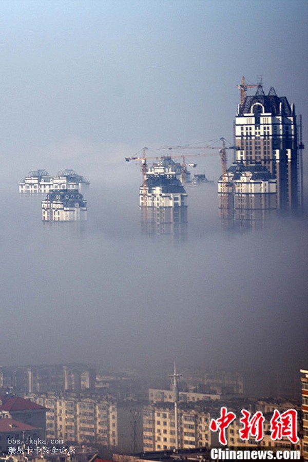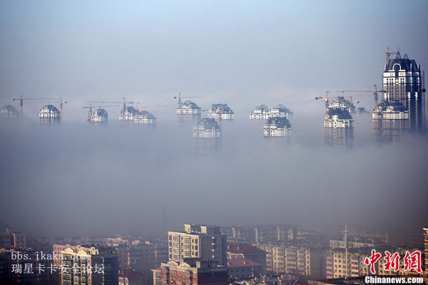 11月6日,哈尔滨市出现大雾天气,主城区雾较小,城市周边雾大,一些高楼楼身在雾中,只露楼顶,呈悬浮状,如童话里的世界。