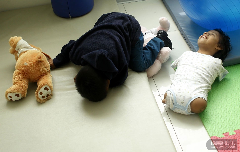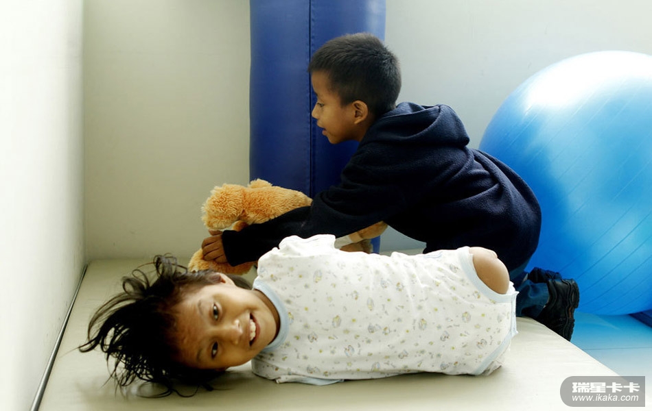 2011年11月29日,秘鲁利马,身患四无肢畸形的8岁女孩拉卢斯与弟弟在地板上玩耍。