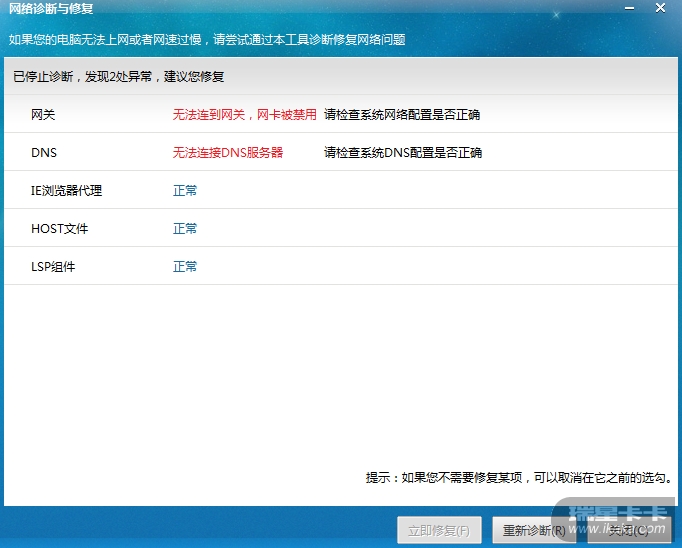 网络诊断这一项,修复选修说前面可勾选,但是找不到勾选