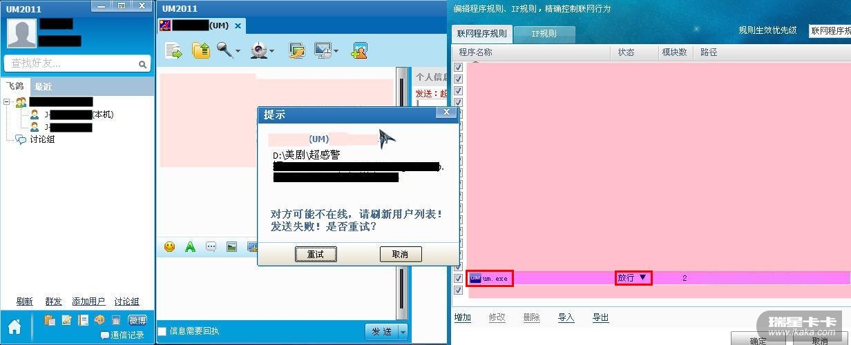 如图我已经在防火墙规则理放行的UM程序,但是UM在点对点传书文件时(在同一个局域网内,两台机器之间传送),不是响应缓慢(对方点接受后会间隔几十秒才能发送),就是没有传完就自动终止。