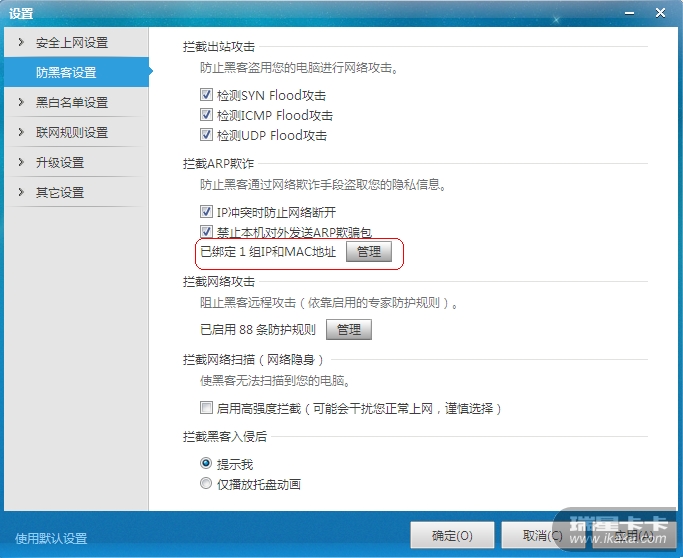 建议您绑定网关IP地址及MAC地址尝试,参考下图设置