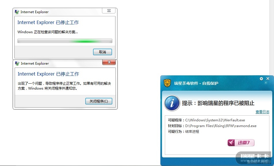 第1种情况:打开淘宝网页瑞星杀毒软件就提示自我保护,影响瑞星的程序已被阻止,同时IE就停止工作,(如图1),(此问题只对淘宝网页是这样的,其它网页打开没有影响)