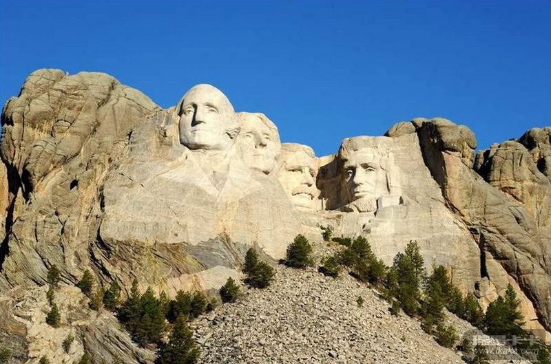 美国南达科他州有一座拉什莫尔山,山高1800多米,刻有华盛顿、杰斐逊、罗斯福、林肯4个巨大的石雕像,石像的面孔高18米,鼻子有6米长。4个巨像如同从山中长出来似的,山即是像,像即是山,巨像与周围的湖光山色融为一体。