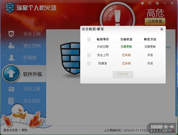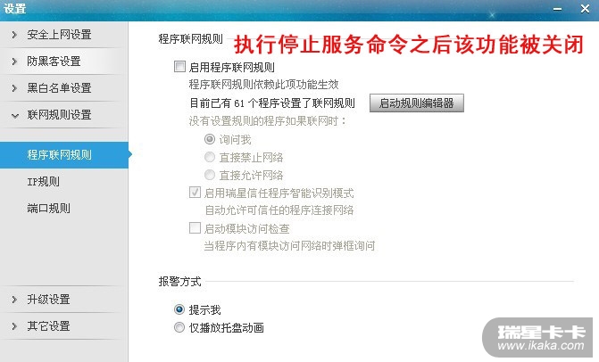 加载驱动没有验证,自身的驱动不保护,居然可以被冒牌。被批处理执行停止服务之后,联网程序规则被关闭。当大部分功能丢失之后,会造成老毛病:本机无法上网!!建议:希望瑞星防火墙能够解决上述毛病,并且,检查赞成防火墙功能丢失之后,用户本机无法上网的原因!!(建议主程序判断功能是否缺失,如果缺失右下角提示用户重装防火墙,并且将所有的规则默认放行,以免造成重现瑞星防火墙(2010/2011)用户无法上网的杯具)