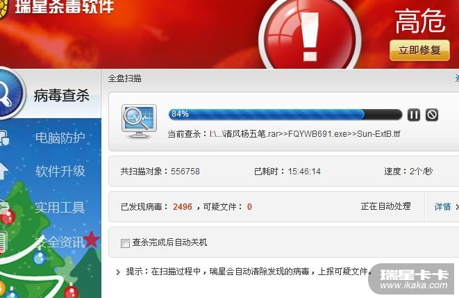 终于用卡巴斯基解决了,瑞星还是需要提高一下的。不需要格式化,用卡巴斯基全盘查杀就搞掂了。谢谢大家