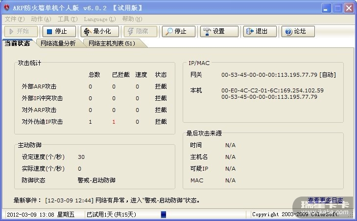 我是pppoe宽带连接,4M联通独享 拨号连接,我是单机用户,只有一台电脑,一条宽带,瑞星却老提示遭到arp攻击,我快抓狂了,瑞星老提示ip地址冲突,arp包内容有地址冲突,已拦截arp攻击,于是我把整个硬盘格式化了一遍,然后重装系统,然后就没有提示arp攻击了,过了几天又提示遭到arp攻击,杀毒又没有病毒,用windows清理助手查了,也没有木马,于是我又安了彩影arp防火墙,彩影老提示检测到非可信路由的ip数据包,彩影显示网络主机列表居然显示有45台主机。。。。。5555。。。。。泪奔。。。。。查毒杀毒也没用,打了arp补丁瑞星还是继续提示有arp攻击。。。。。。。。重装并格式化系统也没用。。。。请各位帮忙想想办法吧。。。。。。