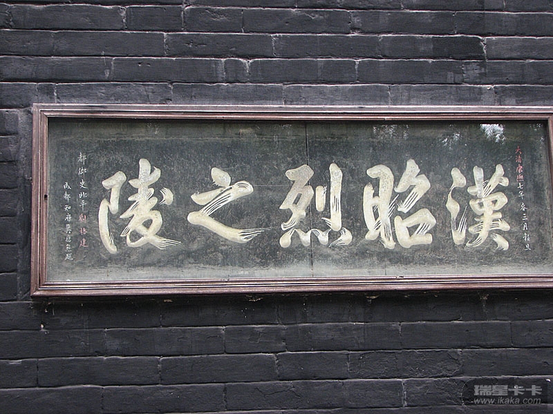 “汉昭烈陵”是三国时蜀国开国皇帝刘备的陵寝,史称“惠陵”,位于成都市武侯祠内。陵墓占地2000平方米,封土高12米,有一道180米长的砖墙环护。陵前有“汉昭烈皇帝之陵”碑,清乾隆五十三年(1788年)立。史载,刘备于223年4月病逝于今重庆市奉节县的白帝城后,由蜀国丞相诸葛亮运回成都,于当年8月安葬;刘备的甘、吴二位夫人也合葬于此墓中。刘备墓现有门匾“汉昭烈陵”及“千秋凛然"对联:“一杯土尚巍然,问他铜雀荒台何处寻漳河疑冢;三足鼎今安在,剩此石鳞古道令人想汉代宫仪”。