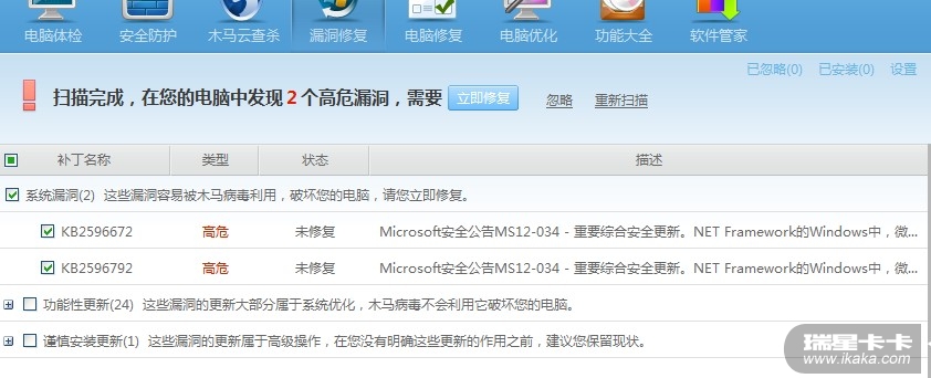 在瑞星安全助手更新后漏洞修复在系统漏洞里会发现高危漏洞,需要手动修复,但是有时候发现右上角有个已忽略选项中自动出现类型标示为“高危”的补丁,这是什么情况,是这补丁经验证是可以忽略的还是有其它问题呢:kaka2: