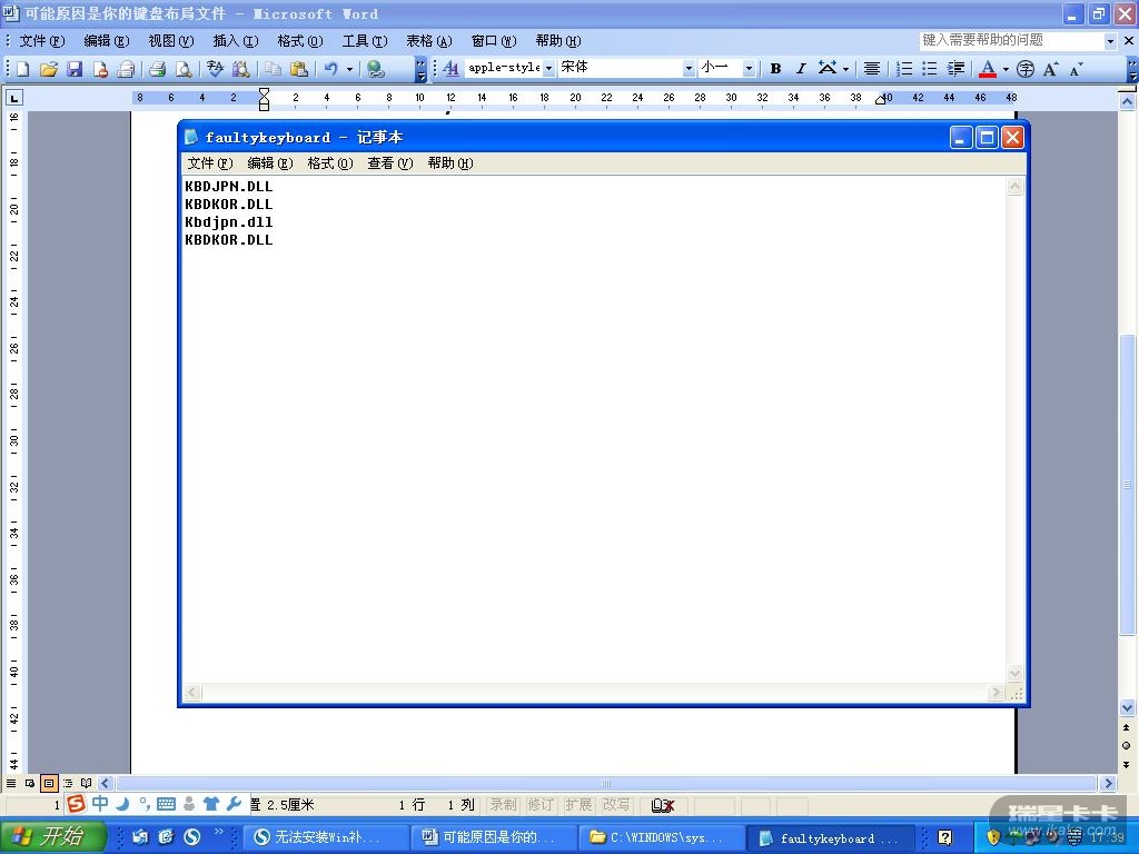 1.在Windows目录下,打开Faultykeyboard.log文件,这个日志文件中记录了system32目录下缺少的并且已经在系统中注册了的键盘布局(layout)文件。