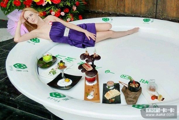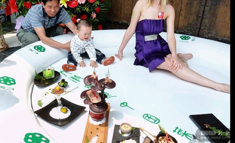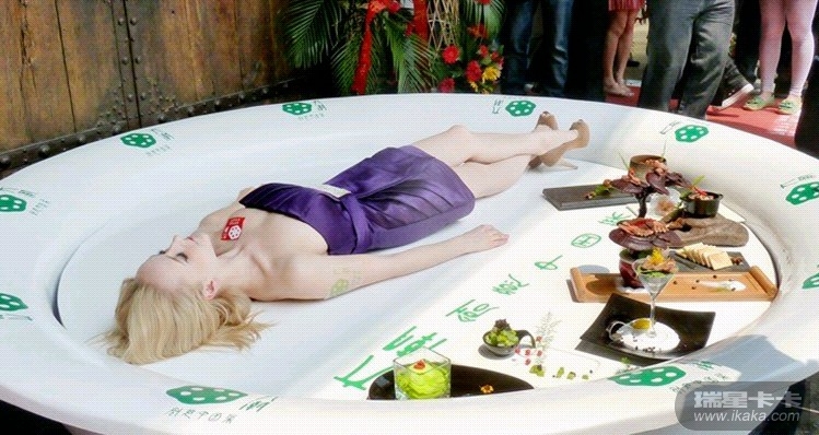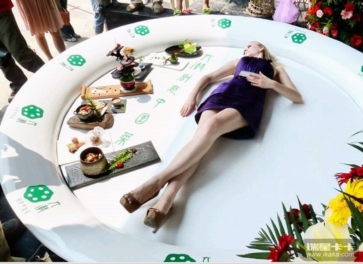 南京某家餐馆开业现场,来自立陶宛的模特在硕大菜盘里摆出各种POSE造型,引发市民围观。