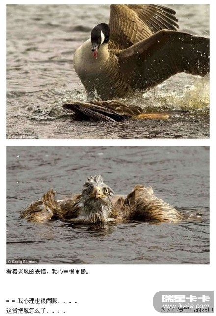 谁说大鹅好欺负?老鹰为了找吃的掉到湖里,结果被大鹅暴揍。。。看着老鹰的表情,我心里很闹腾。。。
