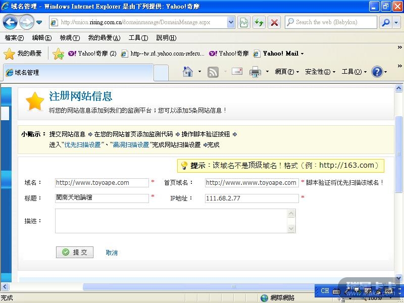 域名这里输入:toyoape.com,首页域名输入:http://www.toyoape.com